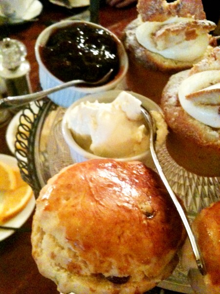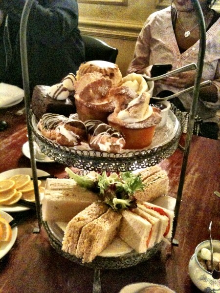 Tiered serving platters instantly appeared laden with finger sandwiches, brownies, cakes and, my favourite, scones with CLOTTED CREAM. I adore clotted cream although my arteries probably are against it, along with fresh strawberry jam. Heaven. Served alongside all those lovely pastries were loose leaf tea in charming blue and white china.