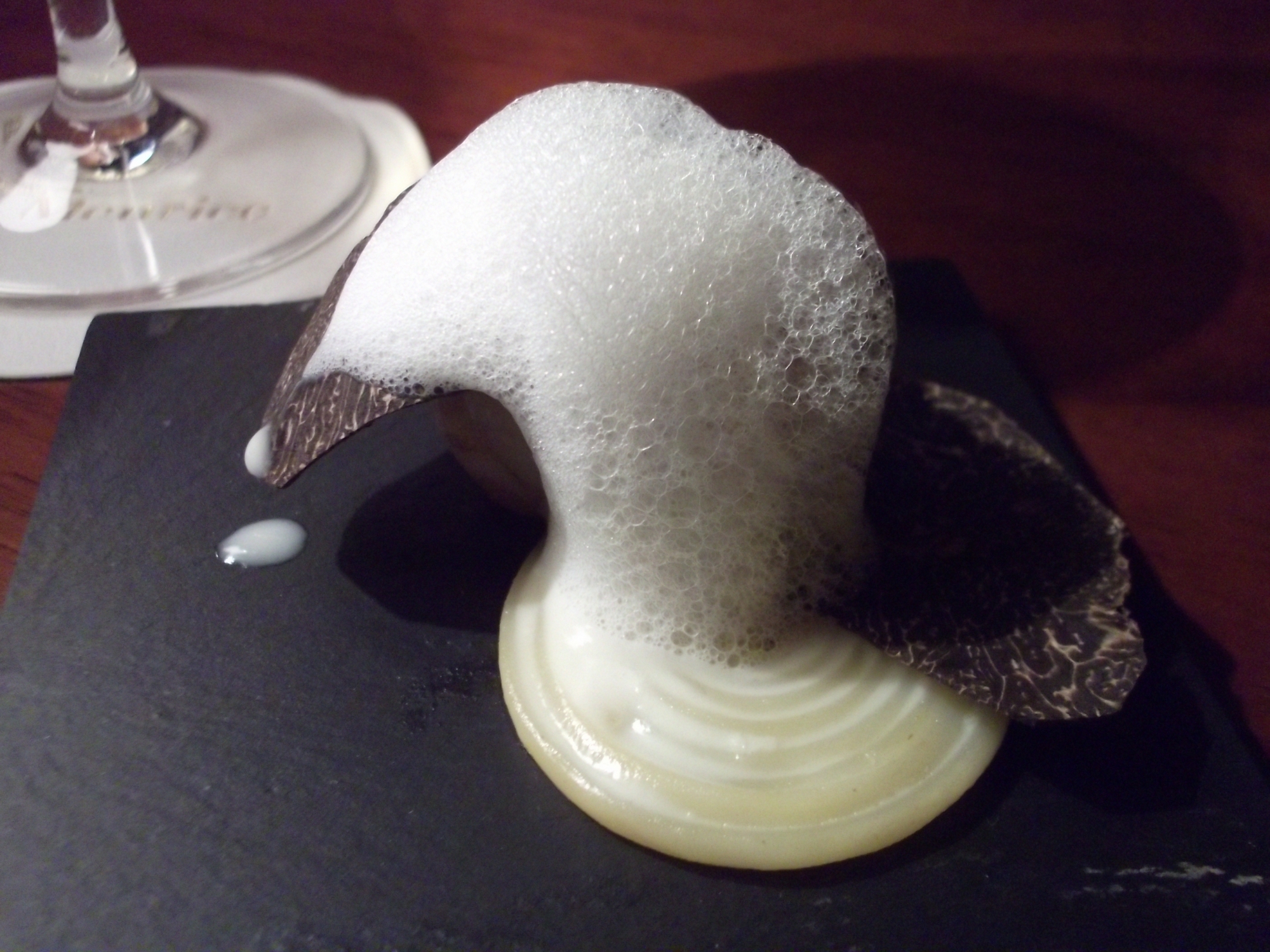 Next was a Chilean S. blanc. Estelle really was surprising me with her New World choices. Errazuriz is a big producer but their 2010 was well done if again very full and lush but having enough acidity to not be a flabby drink. This was not what I was expecting, but paired with Tourteau percuté et rôti au four avec du beurre demi sel, nage glacée et tuile aux algues (Crab meat roasted in the oven with salted butter, frozen stock and crisp nori leaf) was just the ticket. The crab had been cooked in butter but in such a way as it was bursting with flavour but not greasy or heavy.