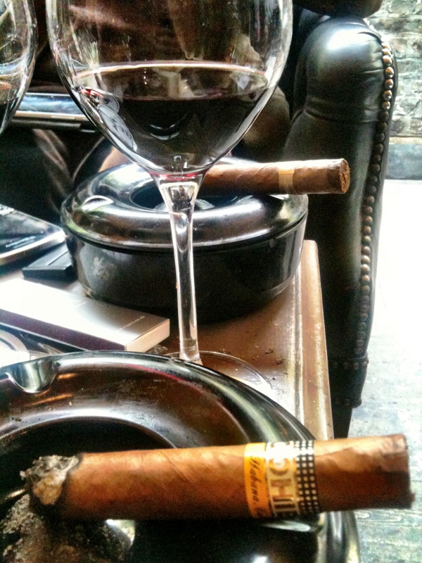 Alvaro is an ex-sommelier and he often noticed that diners would often have a cigar after lunch or dinner with the last of their red wine. When one thinks of cigars, it’s usually port or brandy that springs to mind as an accompaniment. However, even though cigar and red wine are not a classic pairing, they are often a common pairing. This got Alvaro to thinking and before you know it, we were sitting in the outdoor cigar lounge of Home House in Mayfair, lighting up some stogies as an experiment to see how well they would match with red wine.