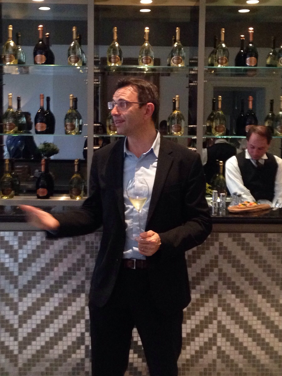 Fred came bounding into the room, slightly wet as he had walked from his hotel to meet us at the offices of LVMH. While we had been waiting for Fred, we had sipped on Ruinart’s NV Blanc de blanc, which is always a light and delightful champagne. It is one of my favourites. Once Fred had a glass of the 2004 in his hand, he told us a bit about Ruinart’s champagne making philosophy. He compared the NV Blanc de blanc as a wine of teamwork – he and his team make the champagne.